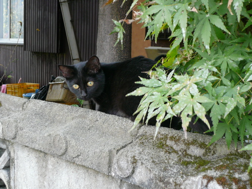 黒猫ちゃんが塀の上にいました。